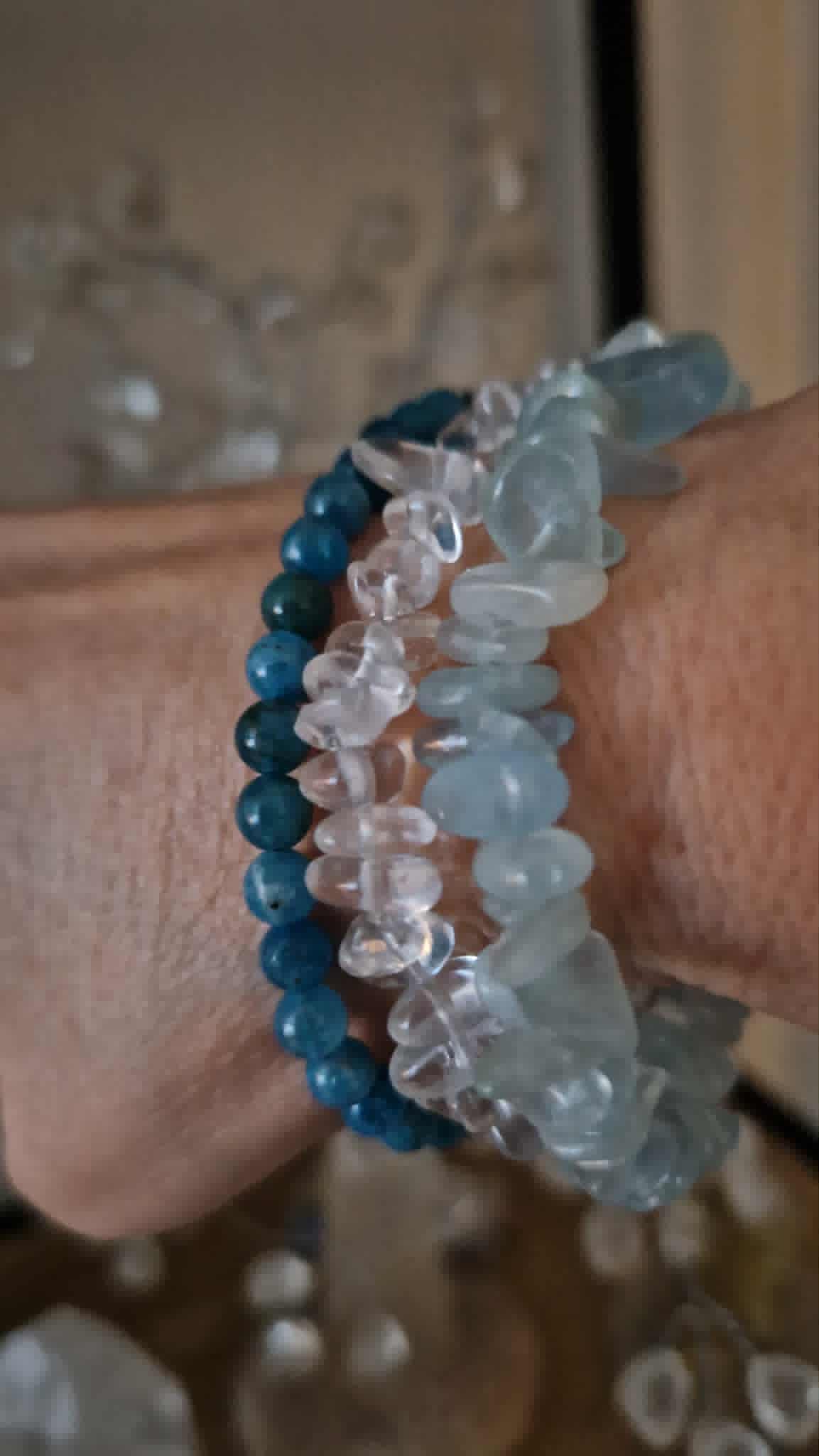 - Akvamarinen er kjent for å hjelpe til å beskytte og rense auraen din. En stein av ro, fred og harmoni. Det er en stein som oppmuntrer til kommunikasjon og til å snakke din sannhet forsiktig og med klarhet. Den motiverer deg til emosjonell healing og vekst, gjør tankene dine klarere, en krystall som også beroliger deg i tankekjør som til tider kan spinne. Elastisk chips-armbånd.